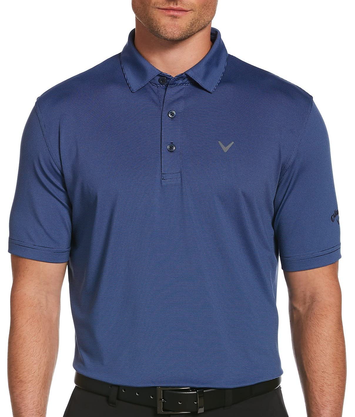 This Callaway men's golf polo It's crafted from lightweight stretch fabric for full range of motion from tee to green. Moisture-wicking technology keeps you cool and dry, and UPF 50 safeguards your skin from the sun's harmful UV rays. Fine line stripes bring fashionable flair to the comfortable short sleeve polo.